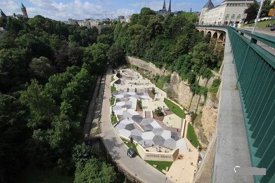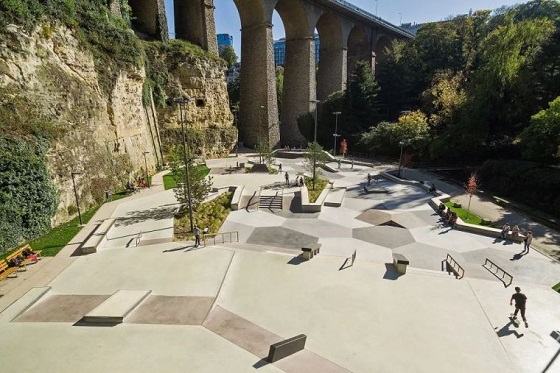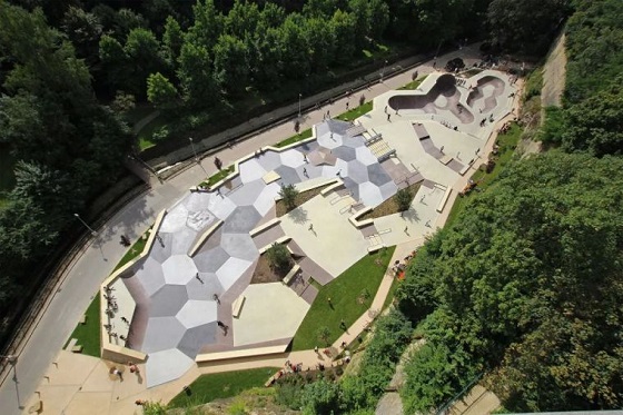 該極限運動滑板公園設計已經融合了游樂場、健身公園、綠地、林間小徑以及家庭野餐區的熱鬧景點。滑板公園的正上方是橫穿一座大橋。